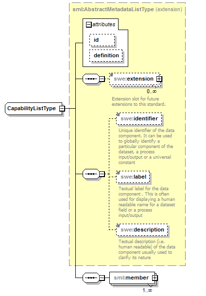 | source | <complexType name="CapabilityListType"> <complexContent> <extension base="sml:AbstractMetadataListType"> <sequence> <element name="member" minOccurs="1" maxOccurs="unbounded"> <complexType> <complexContent> <extension base="swe:AbstractDataComponentPropertyType"> <attribute name="name" type="NCName" use="required"/> </extension> </complexContent> </complexType> </element> </sequence> </extension> </complexContent> </complexType> |