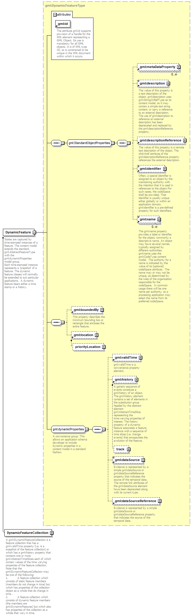 | source | <element name="DynamicFeature" type="gml:DynamicFeatureType" substitutionGroup="gml:AbstractFeature"> <annotation> <documentation>States are captured by time-stamped instances of a feature. The content model extends the standard gml:AbstractFeatureType with the gml:dynamicProperties model group. Each time-stamped instance represents a 'snapshot' of a feature. The dynamic feature classes will normally be extended to suit particular applications. A dynamic feature bears either a time stamp or a history.</documentation> </annotation> </element> |