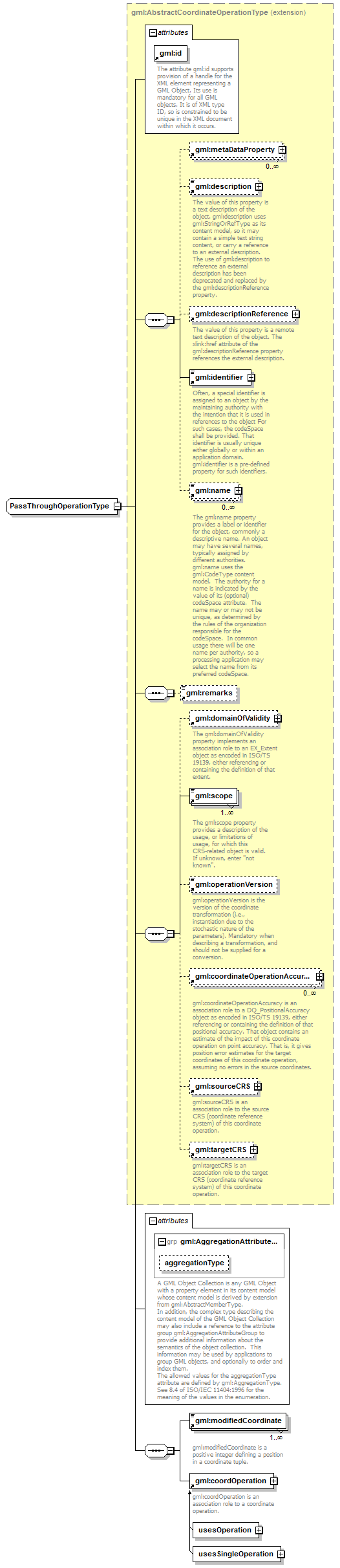 | source | <complexType name="PassThroughOperationType"> <complexContent> <extension base="gml:AbstractCoordinateOperationType"> <sequence> <element ref="gml:modifiedCoordinate" maxOccurs="unbounded"/> <element ref="gml:coordOperation"/> </sequence> <attributeGroup ref="gml:AggregationAttributeGroup"/> </extension> </complexContent> </complexType> |