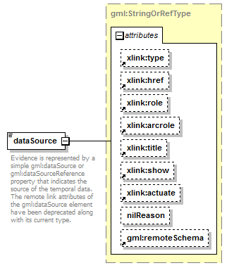| documentation | | Evidence is represented by a simple gml:dataSource or gml:dataSourceReference property that indicates the source of the temporal data. The remote link attributes of the gml:dataSource element have been deprecated along with its current type. |