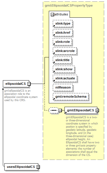 | source | <element name="ellipsoidalCS" type="gml:EllipsoidalCSPropertyType"> <annotation> <documentation>gml:ellipsoidalCS is an association role to the ellipsoidal coordinate system used by this CRS.</documentation> </annotation> </element> |